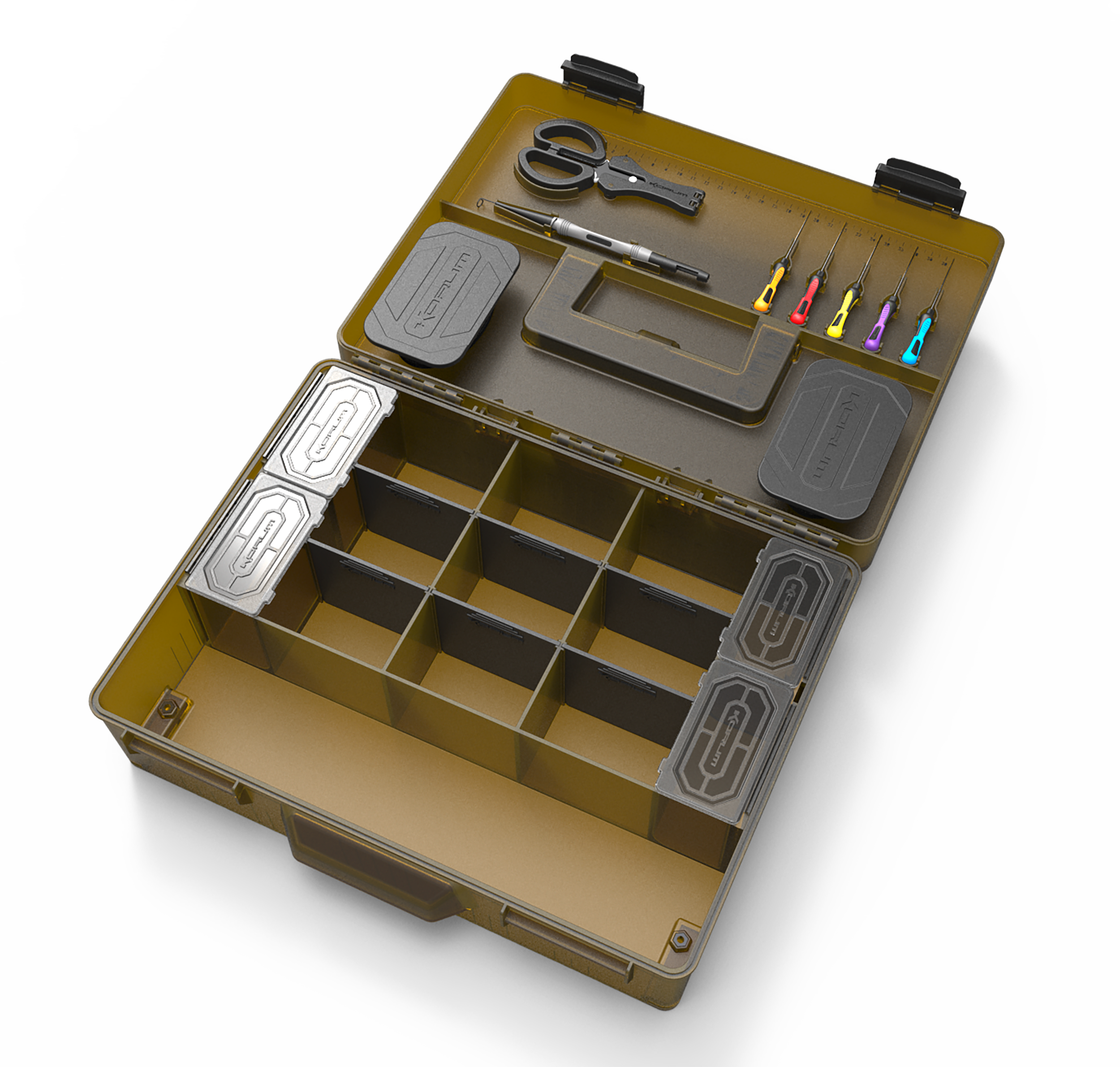 Una stazione di pesca completa in formato XL! Korum Mega Blox Fully Loaded è il compagno perfetto per ogni sessione di pesca; conserva l’attrezzatura per la creazione dei terminali, gli attrezzi e i terminali assemblati in un’unica, solida scatola porta-attrezzi. Abbiamo dimensionato con cura il BLOX per contenere gli articoli indispensabili per la pesca finale, come bobine di lenza, confezioni di ami e accessori. I tuoi attrezzi per l’innesco, lo slamatore e le forbici si incastrano perfettamente, mentre la scatola principale può essere regolata con divisori in base alle tue esigenze. Il coperchio ospita anche due RIG BLOX poco profondi, che proteggono tutti i tuoi terminali pre-legati dagli agenti atmosferici. È dotato di una maniglia di trasporto resistente e sicura, una maniglia laterale, clip di sicurezza e guarnizione. Include anche un righello per legare i terminali. Include: