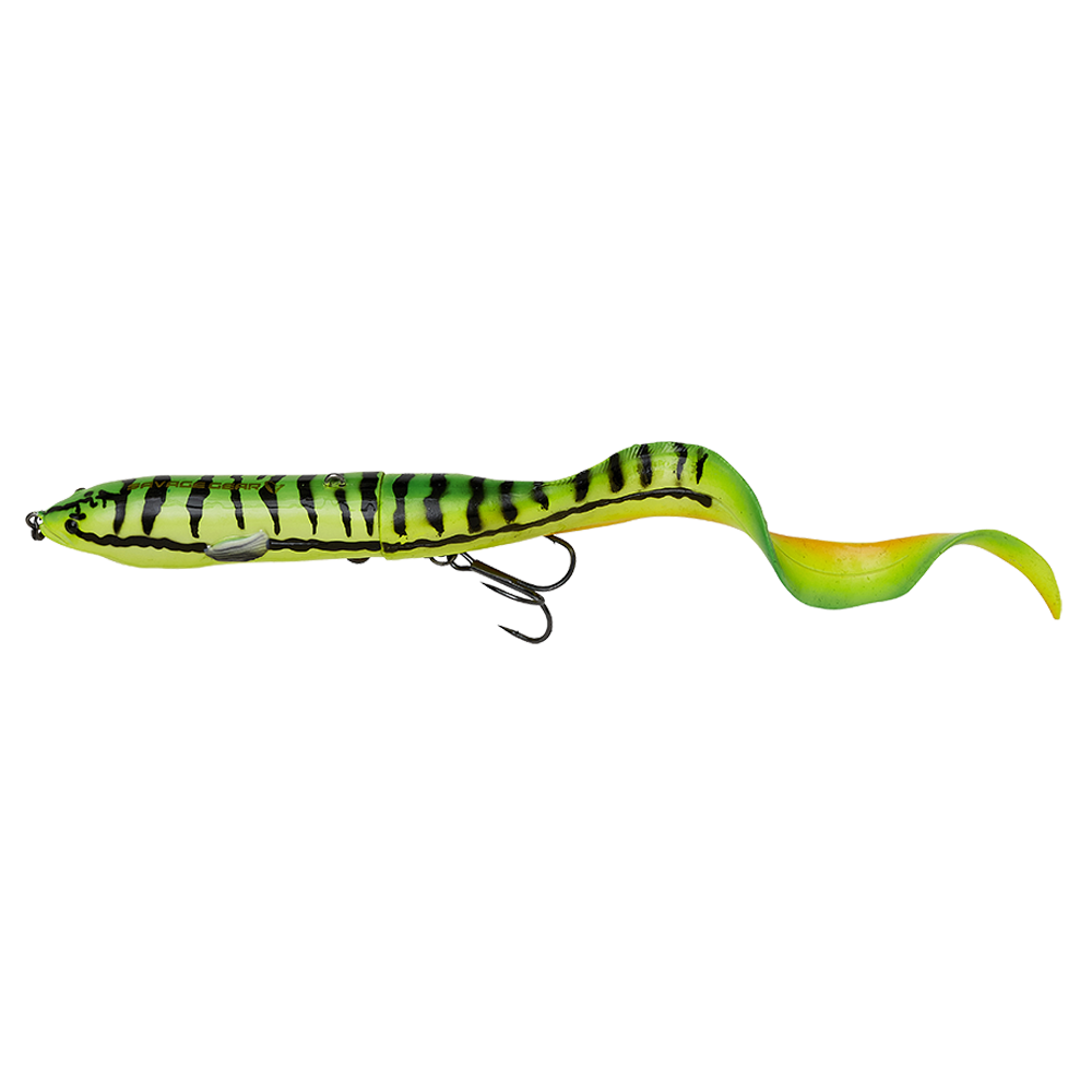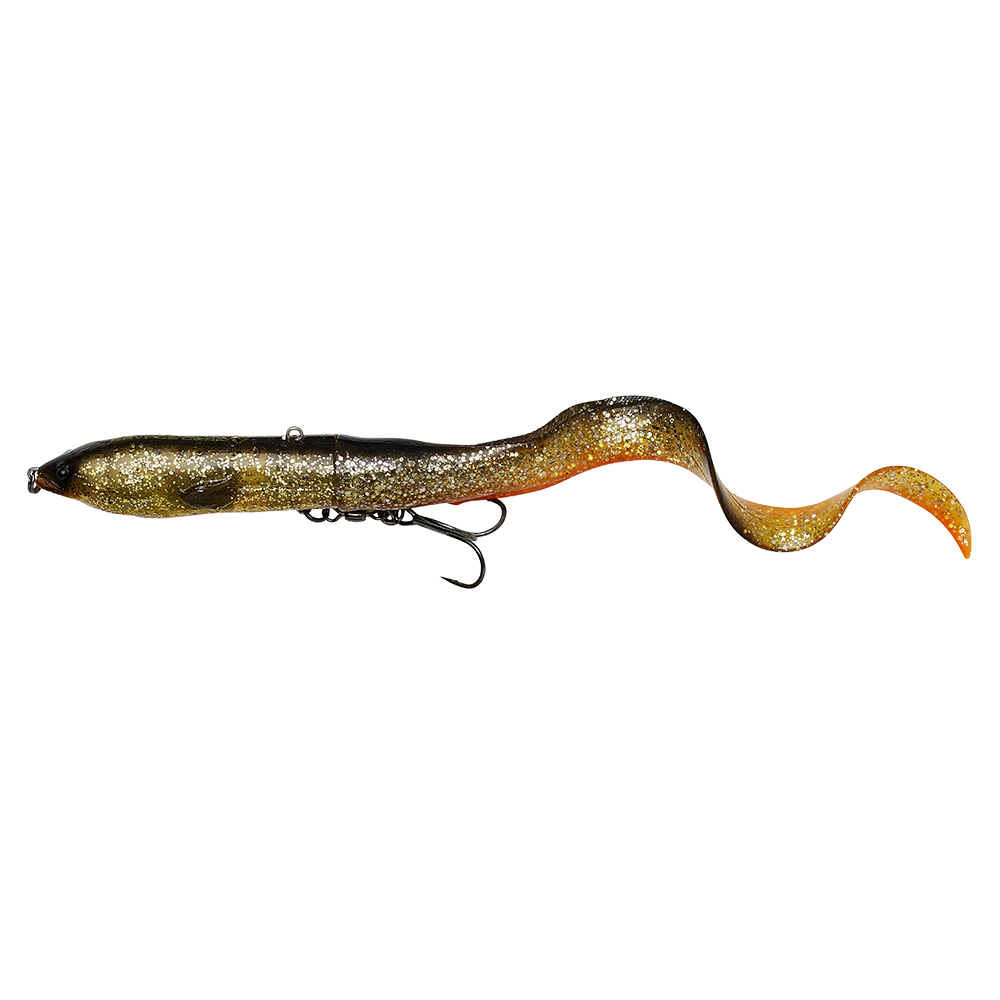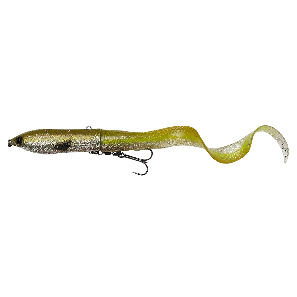 La lunga coda in gomma si collega al corpo rigido attraverso una molla, che la fa oscillare in modo allettante da un lato all’altro come quella di una vera anguilla.